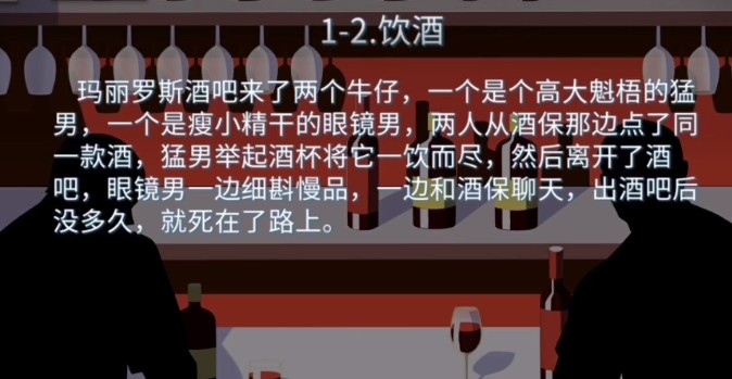 10.第一辑1.2饮酒!玛丽罗斯酒吧来了两个牛仔,一个是个高大魁梧的猛男,一个是瘦小精干的眼镜男,两人从酒保那边点了同一款酒,猛男举起酒杯将它一饮而尽,然后离开了酒吧,眼镜男一边细斟慢品,边和酒保聊天,出酒吧后没多久,就死在了路上!