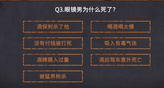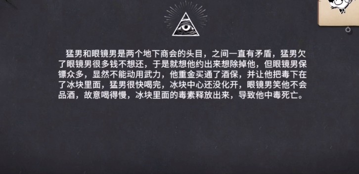 11.眼睛男和猛男都是死于中毒答案是!他们两个是仇人吗,答案是,经过一系列的问题回答,然后找到线索