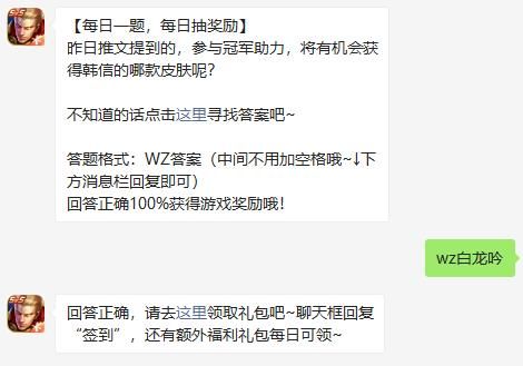 问题:昨日推文提到的,参与冠军助力,将有机会获得韩信的哪款皮肤呢?