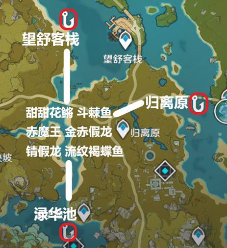 1、找到以上钓鱼点,钓鱼点内有几率刷新数量不等的锖假龙。
