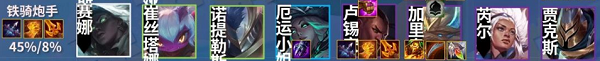 阵容推荐:赛娜、崔丝塔娜、诺提勒斯、厄运小姐、卢锡安、加里奥、芮尔、贾克斯。