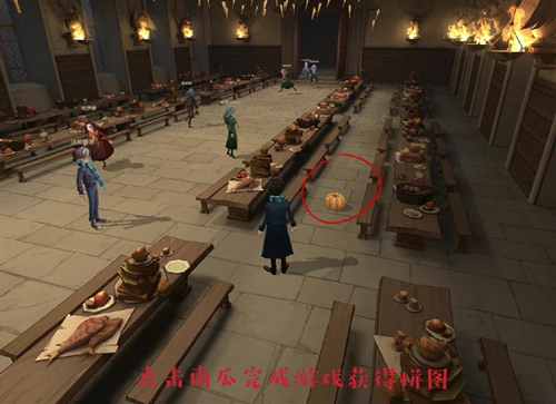 3.来到礼堂后找到地上的南瓜,位于桌子中间!