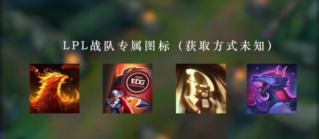 图标方面,这次曝光了蛮多新的图标,其中有一份是LPL战队专属图标,从左到右分别是FPX,EDG,RNG,LNG,这4个战队专属图标目前还不知道如何获取,没有公布具体的获取渠道。