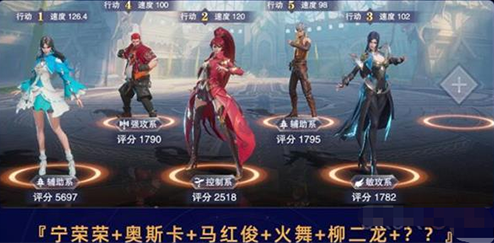 宁荣荣、奥斯卡一个拉条一个回蓝,可以使全队第一回合就放技能打爆发,马红俊的全队灼烧配合火舞能够有效的控制敌方全体。