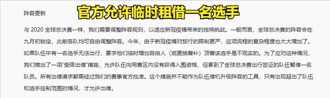 此外,对于本届世界赛的赛制,LOL官方也是及时根据突发情况进行了更新,其中主要在赛制和参赛队伍阵容上做出了一定的调整。在赛制上,由于旅游出行的限制,越南赛区无法参与到本届世界赛,因此,入围赛阶段的队伍由12支缩减为10支,LEC赛区的RGE战队直接升入小组赛。另外,LOL官方考虑到当下大环境的影响,推出了“受限出借”措施,允许参赛队伍向同赛区没获得入围赛资格、但拿到了全球总决赛出行签证的队伍暂借一名队员。但所有出借请求必须经赛事官方批准。