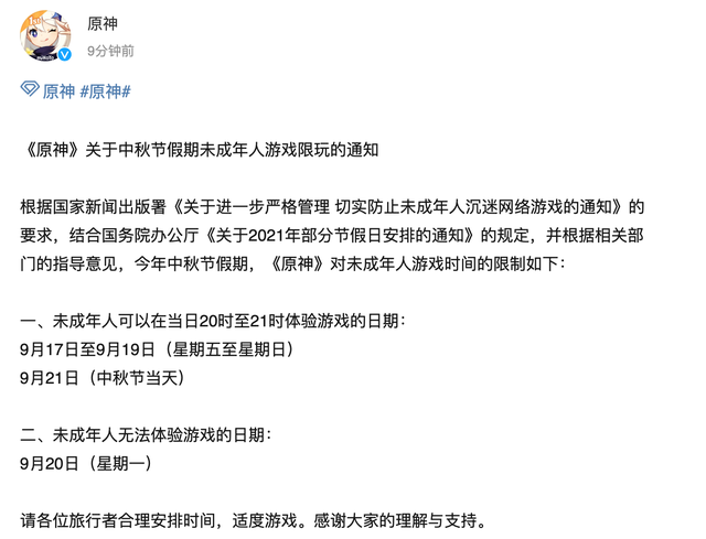 9月16日,@原神 发布中秋节假期未成年人游戏限玩通知,根据国家新闻出版署《关于进一步严格管理 切实防止未成年人沉迷网络游戏的通知》的要求,结合国务院办公厅《关于2021年部分节假日安排的通知》的规定,并根据相关部门的指导意见,今年中秋节假期,《原神》对未成年人游戏时间的限制如下: