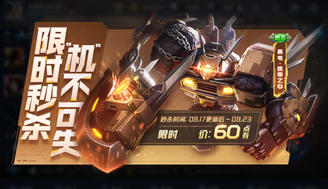 典韦-铁甲之心将在北京时间2021年9月17日上午9点更新后上架,首周折扣60点券,属于勇者品质且限定!