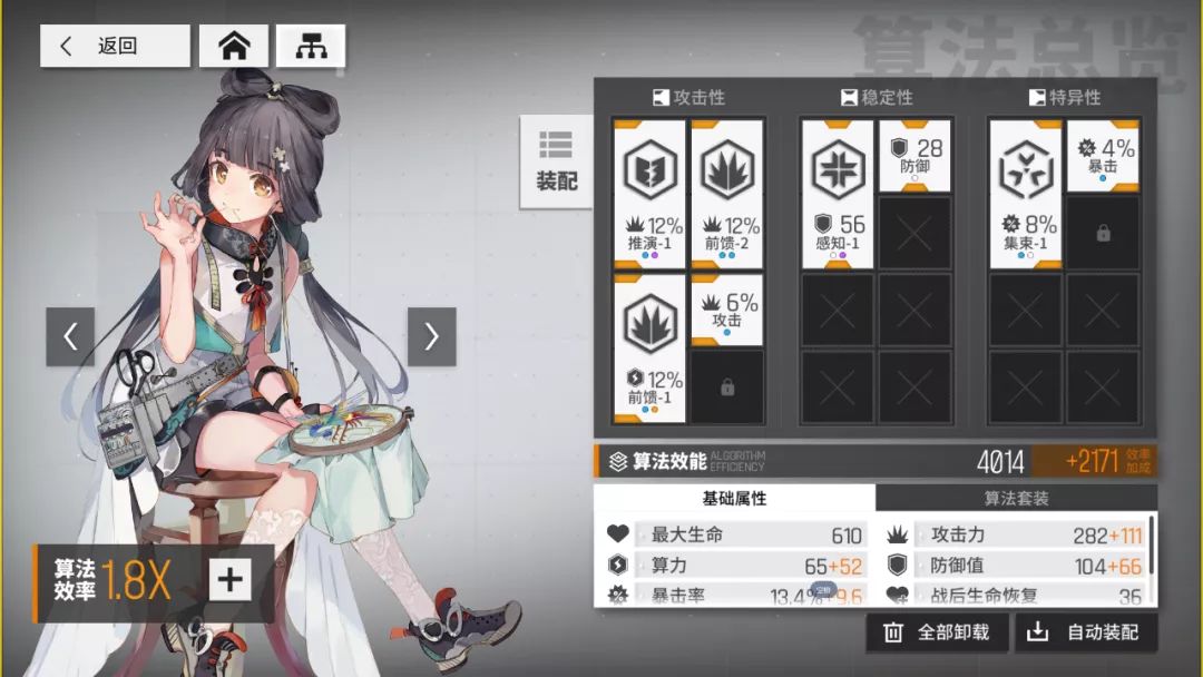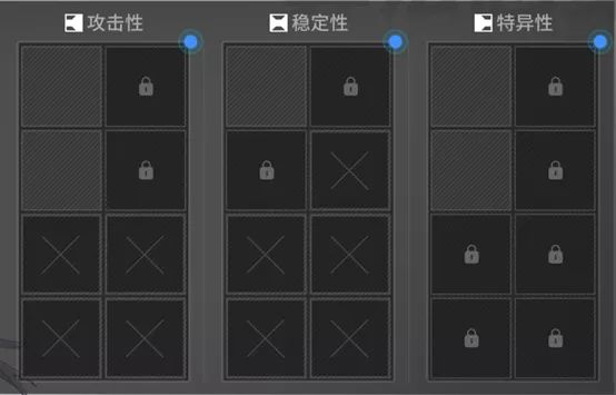 每个角色有三个算法分区,包括攻击性(侧重攻击、算力),稳定性(侧重防御、血量)和特异性(侧重治疗、技能急速、暴击)。算法同理,每个算法也只能插入其对应的分区。