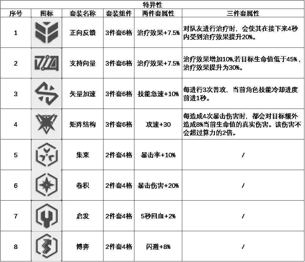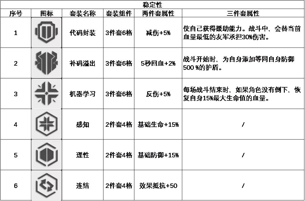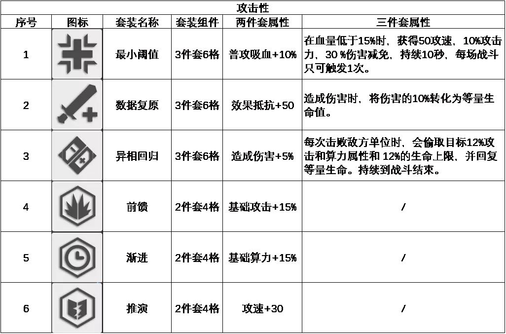 算法套装分两种,2件套4格,3件套6格,通常来说角色到达3星半60级,就可以插入一套3件套了。具体的算法套装如下图。