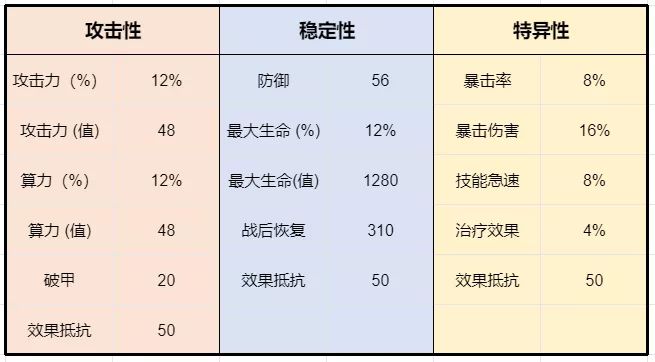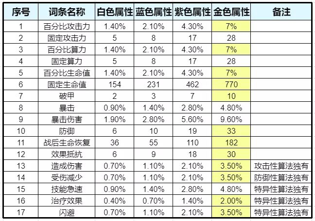 注:标黄格子为估算属性,可能存在5%左右的误差,请谅解。独有属性为仅会出现在该区域算法的副属性中。