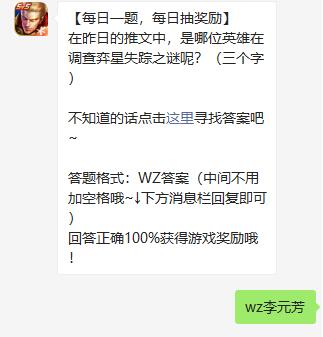 问题:在昨日的推文中,是哪位英雄在调查弈星失踪之谜呢?(三个字)