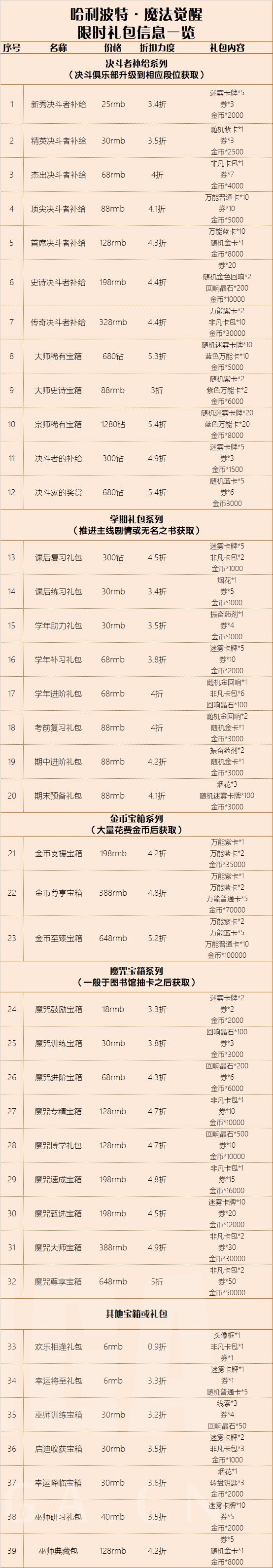 目前主流的限时礼包被我分成决斗者补给系列、学期礼包系列、金币宝箱系列、魔咒宝箱系列及一些零散的掉落物,下面做个简单介绍,具体礼包内容见图!