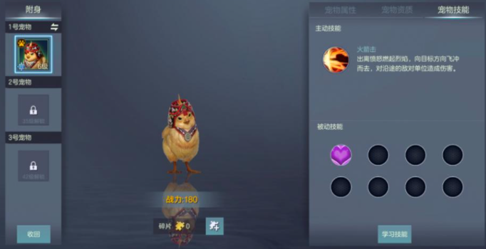2、宠物的技能:等级提升后我们可以解锁宠物的技能点,选择适合的技能进行解锁和升级可以更好的提升宠物的强度。