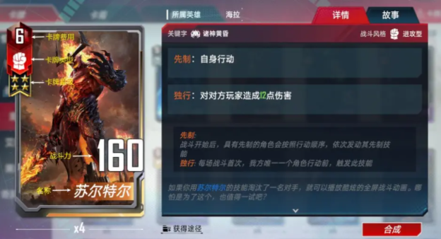 角色牌左上角标识该卡牌的费用、战斗风格和星级。玩家需要在商店花费指定个数的宝石购买该卡牌。