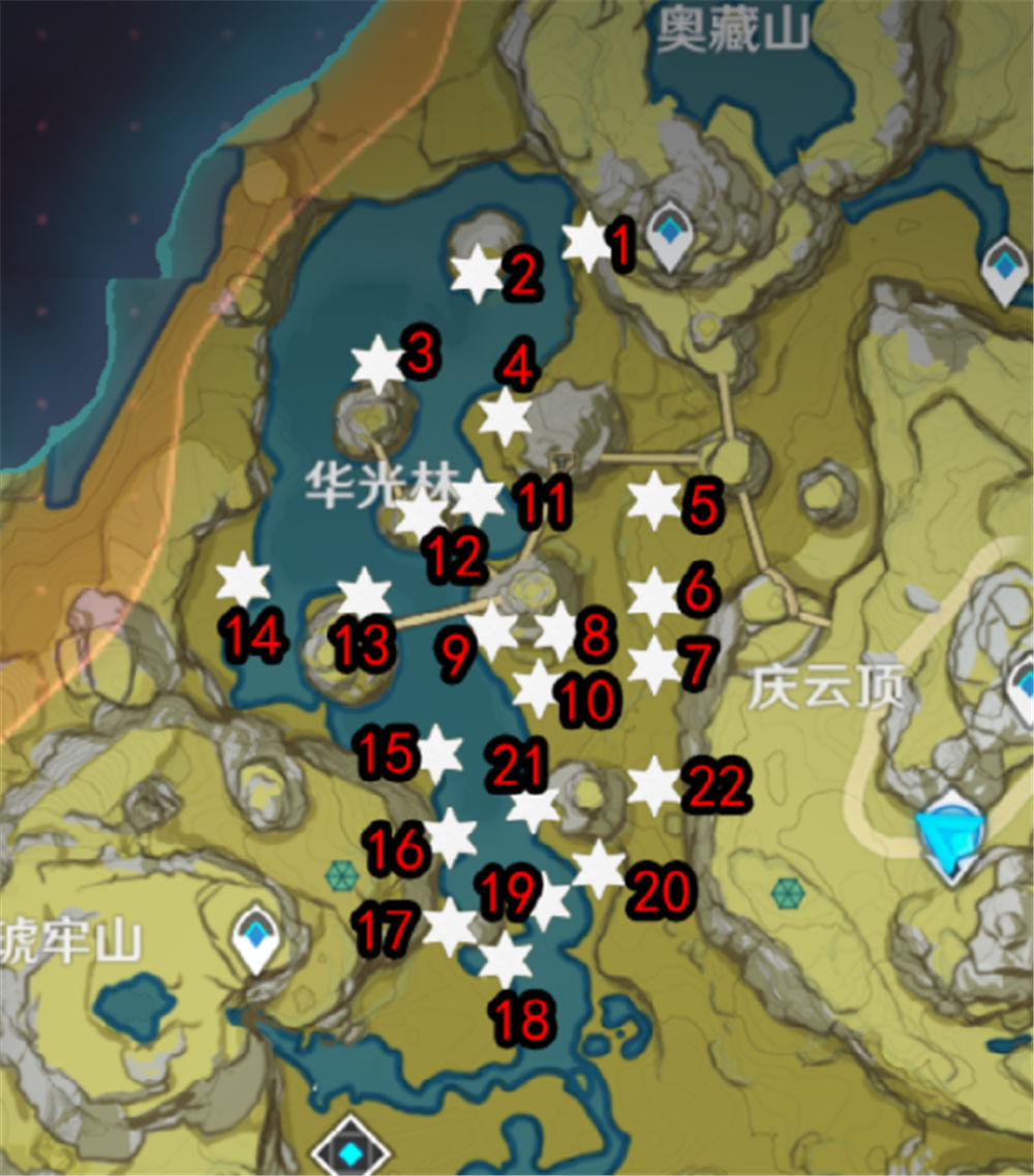 第二十个:河边红色的树下,必须要打一个愚人众才可以解锁。