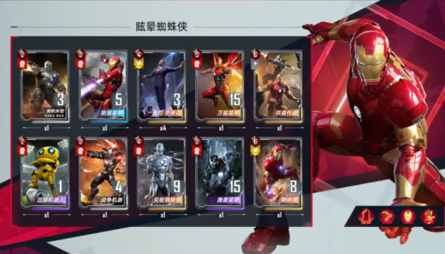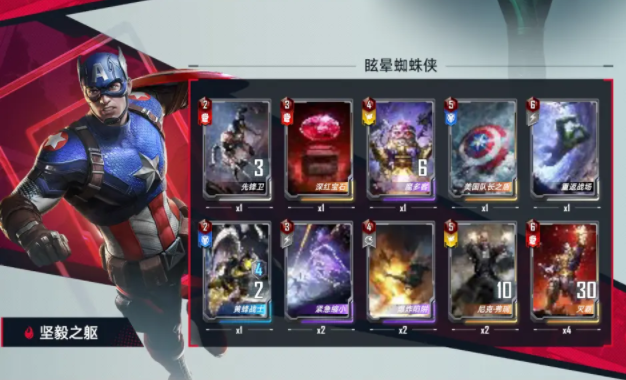 【蜘蛛侠】:至少2,后期核心,也是这套卡组的上限所在。蜘蛛侠带美盾,人称“小索尔”,后期换成面具,拔高阵容上限。可以利用局长升星,8星蜘蛛侠佩戴面具非常恐怖,理论上可获得96x2x6=1152的群体buff;