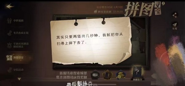 1.今天进入游戏之后,我们先领取巧克力蛙的具体线索:其实只要再坚持几秒钟,我就把你从扫帚上摔下去了;