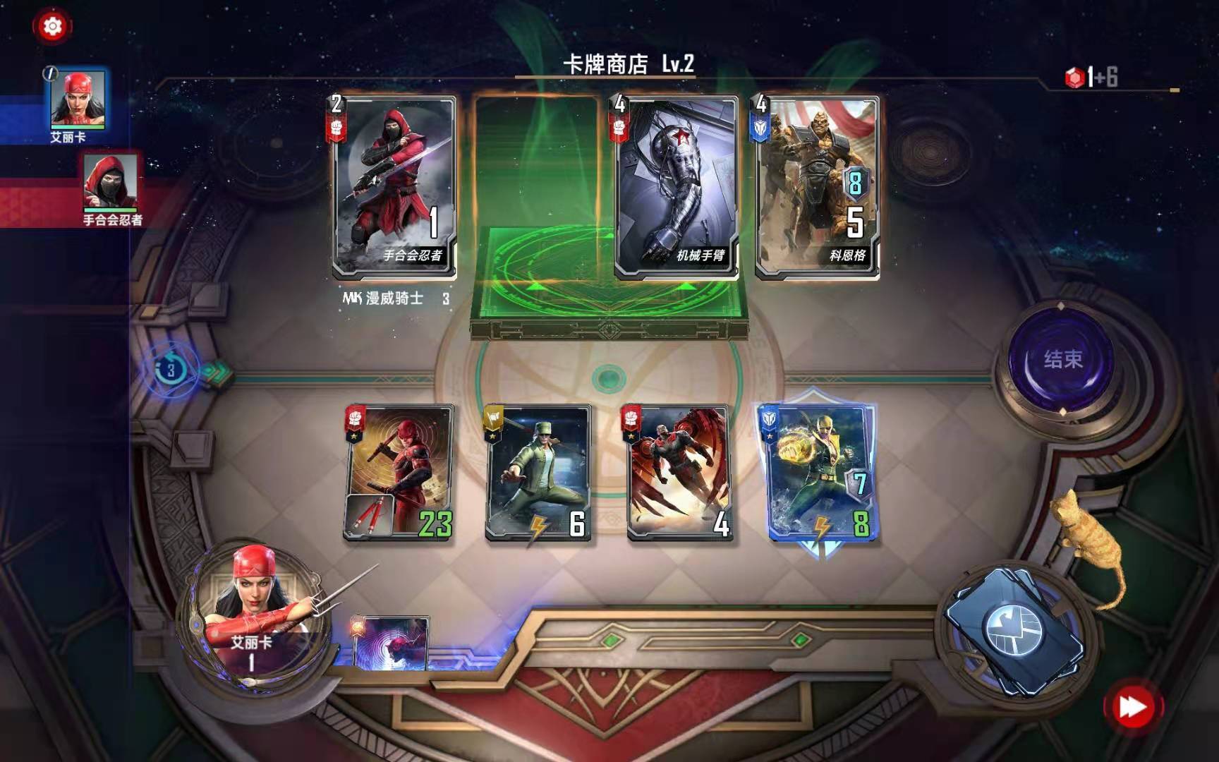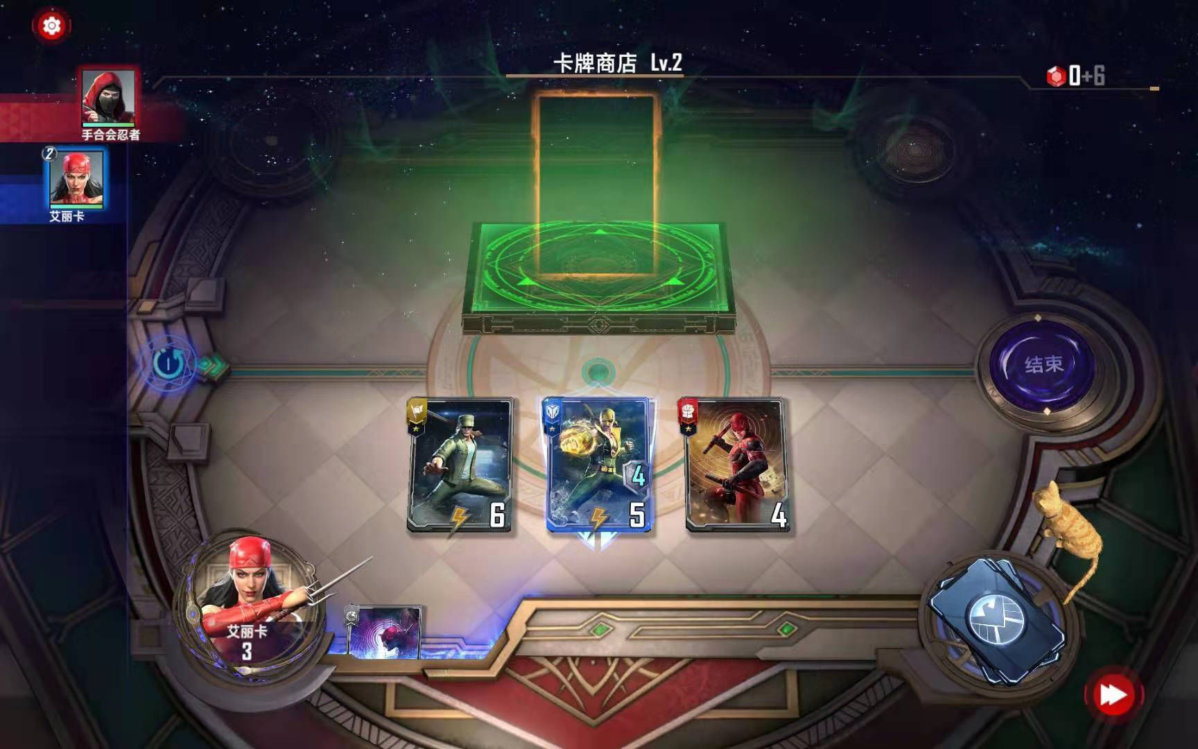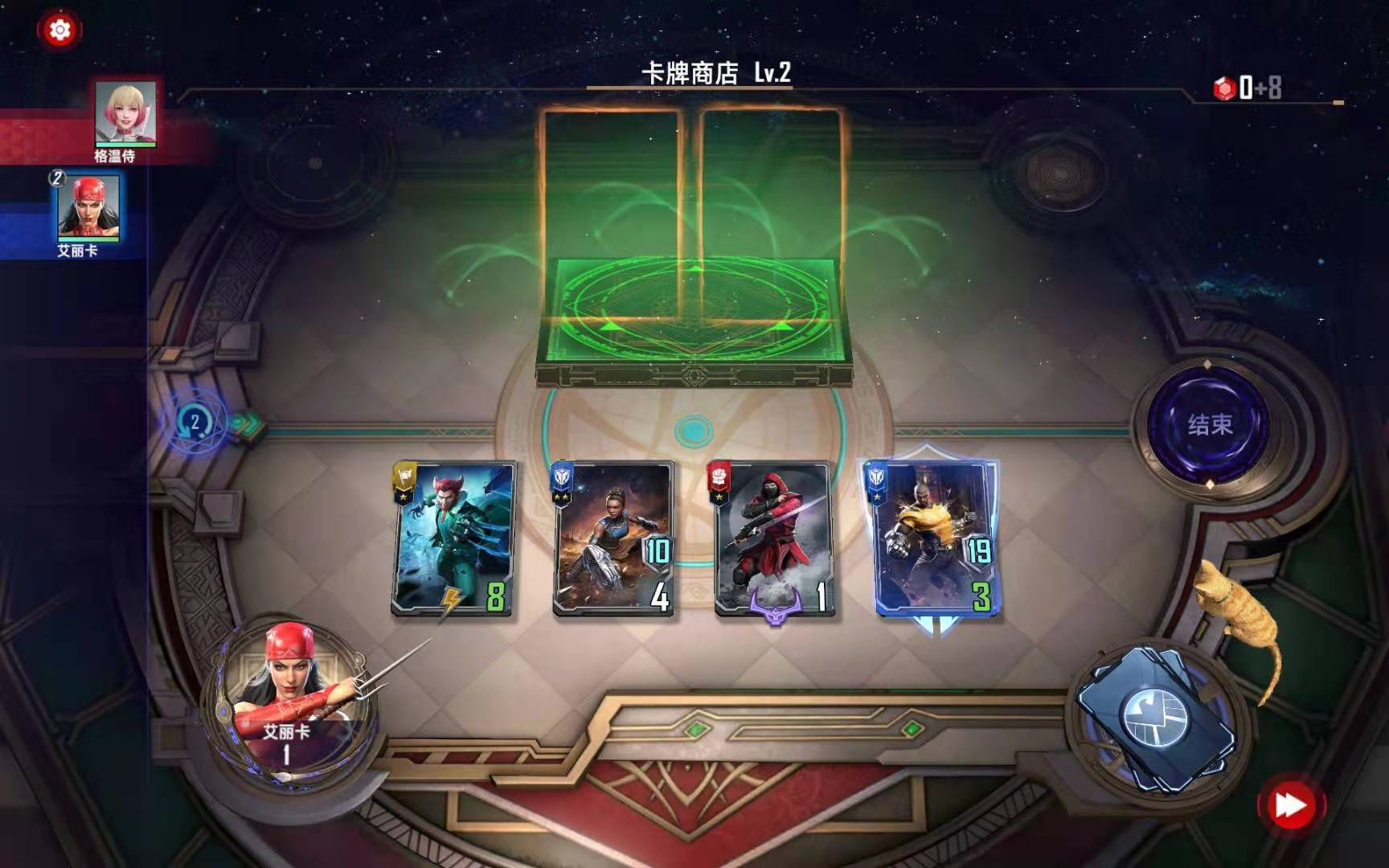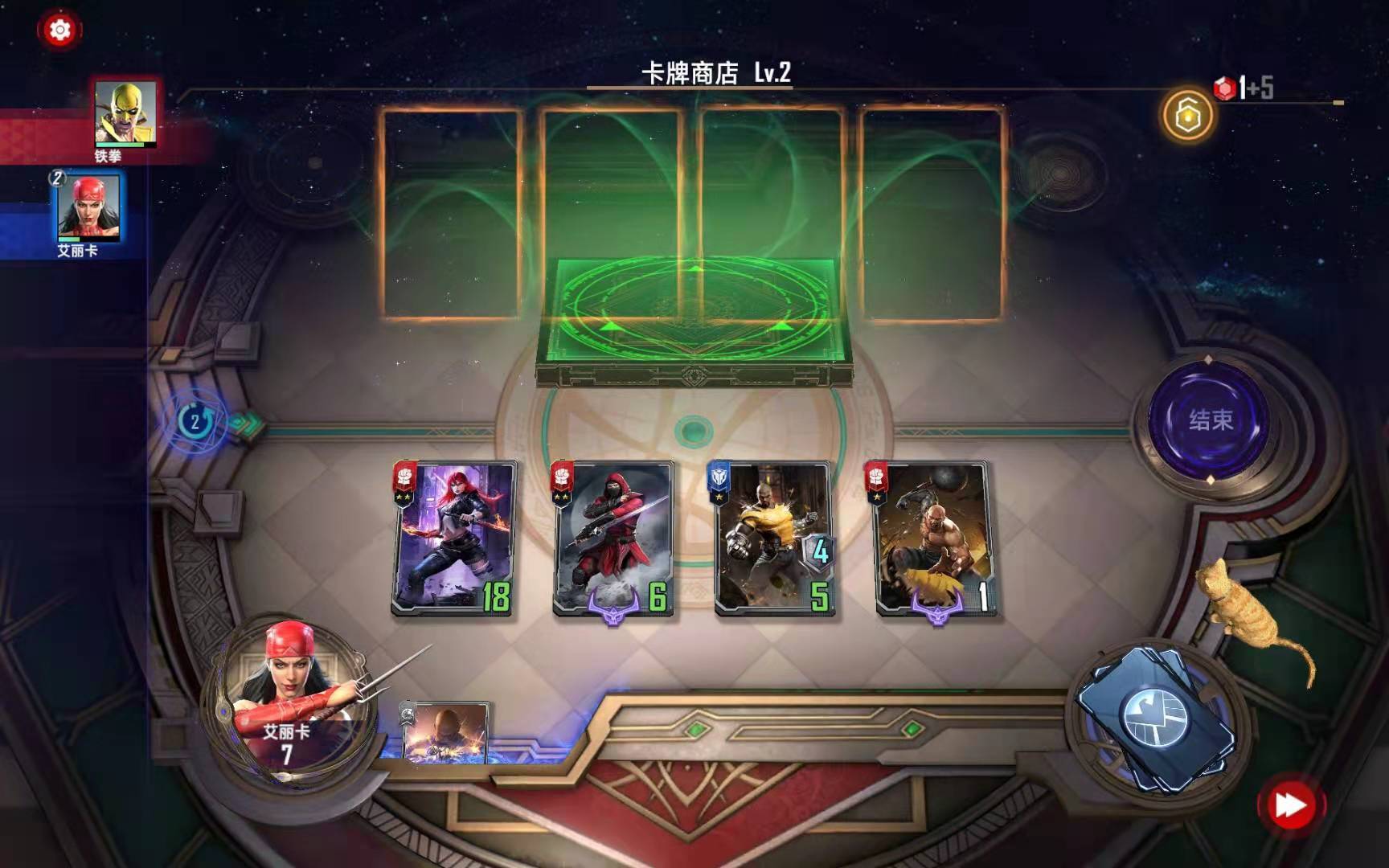 第二小节:购买手合会,然后商店送一张漫威骑士的卡,有经济的话就买下来,我的送的是凯奇,直接升级到了二星凯奇。阵容按照下图摆放: