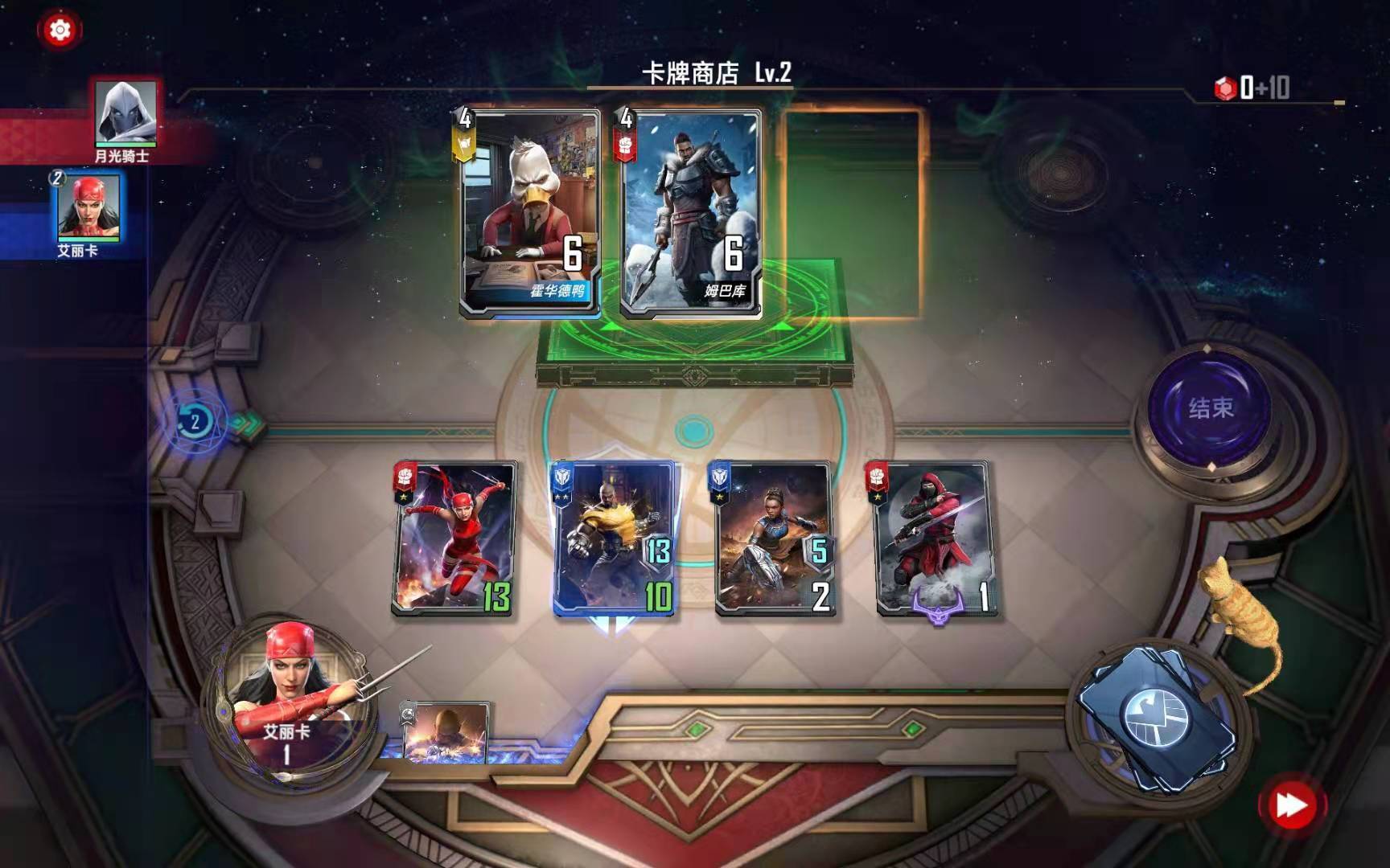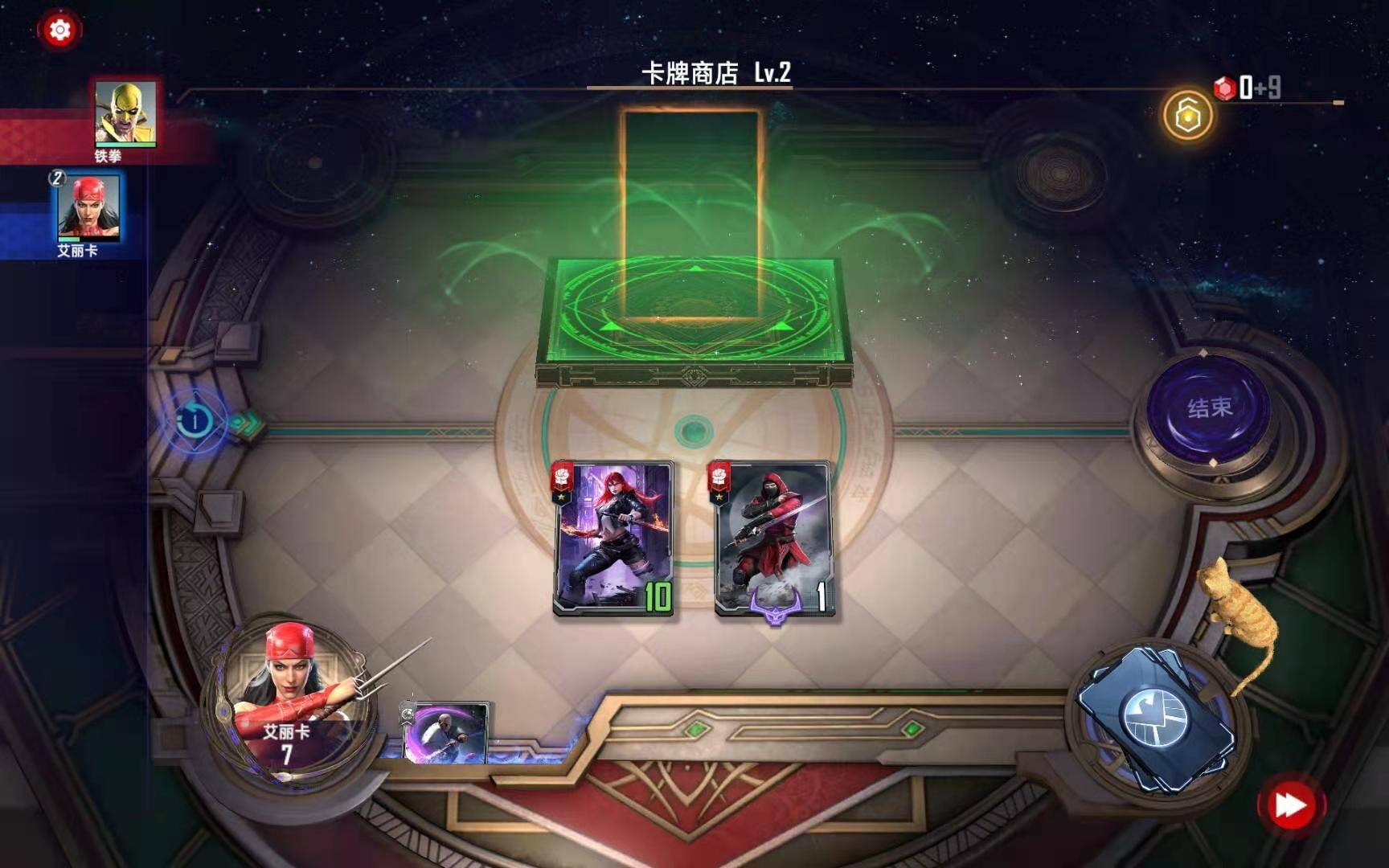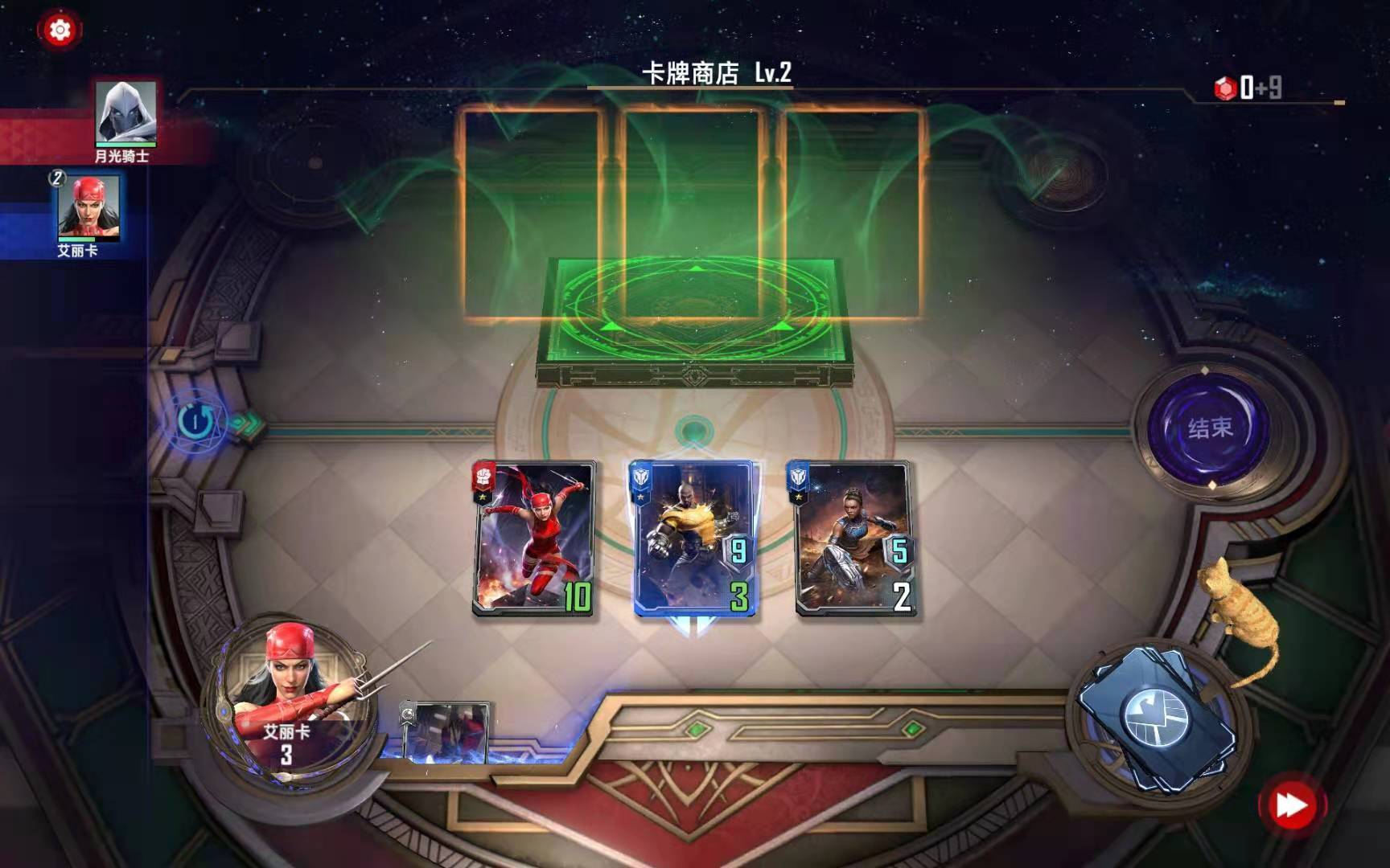 第二小节:购买手合会,然后商店送一张漫威骑士的卡,有经济的话就买下来,我的送的是凯奇,直接升级到了二星凯奇。阵容按照下图摆放: