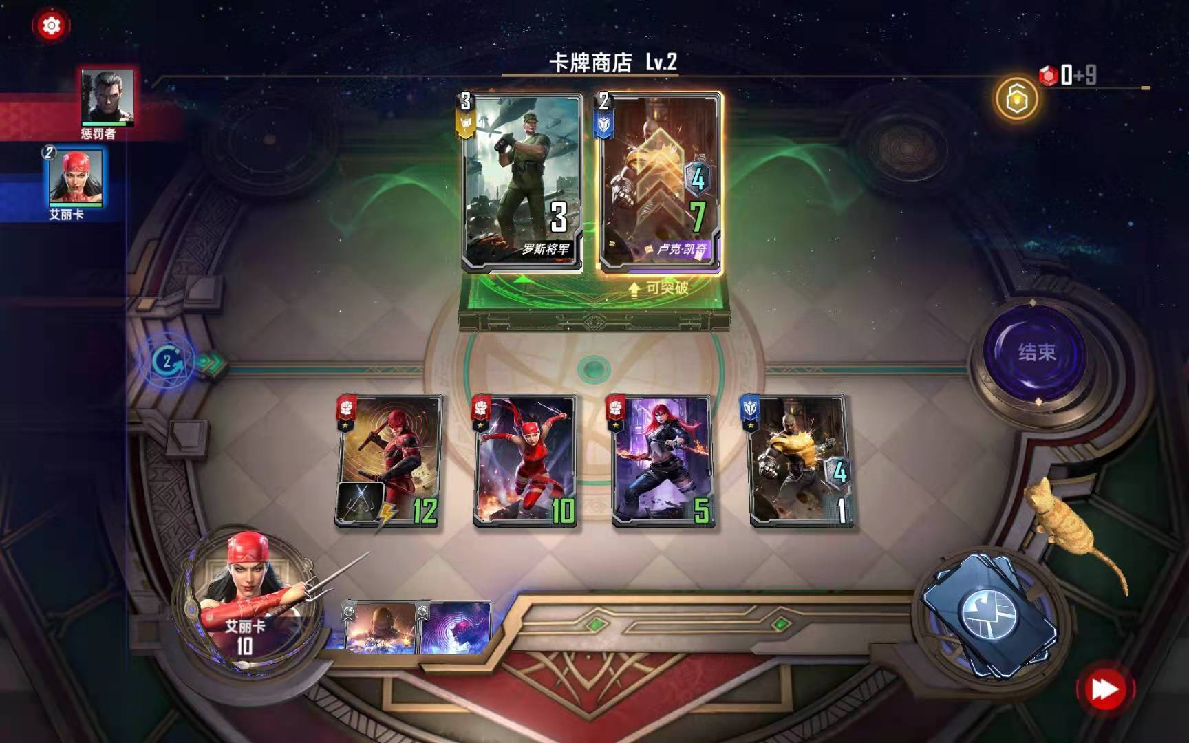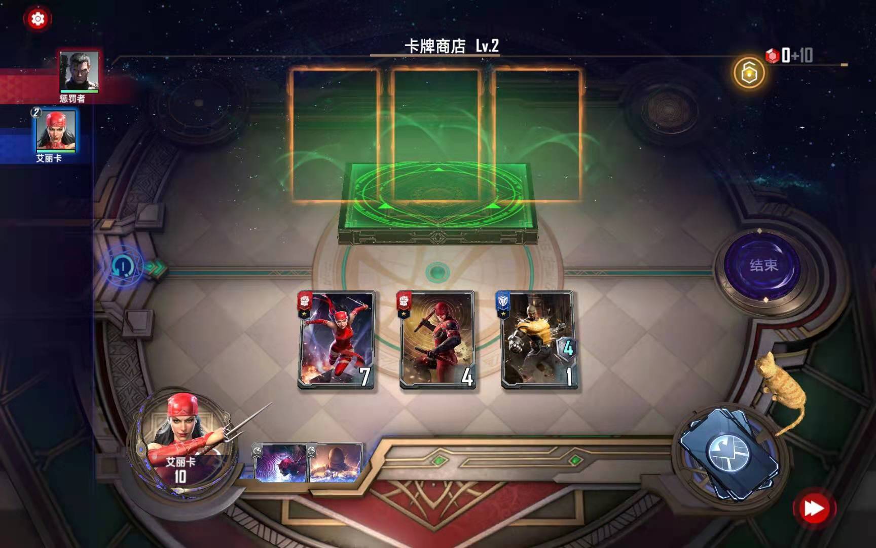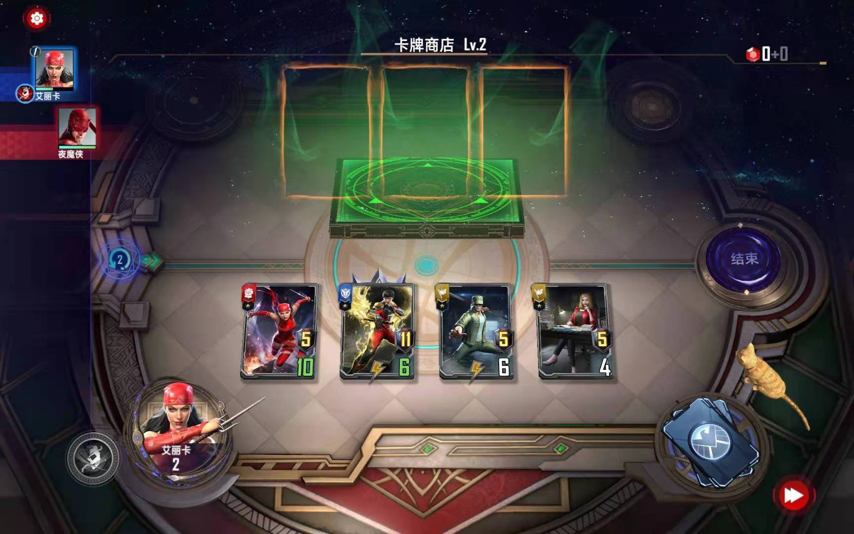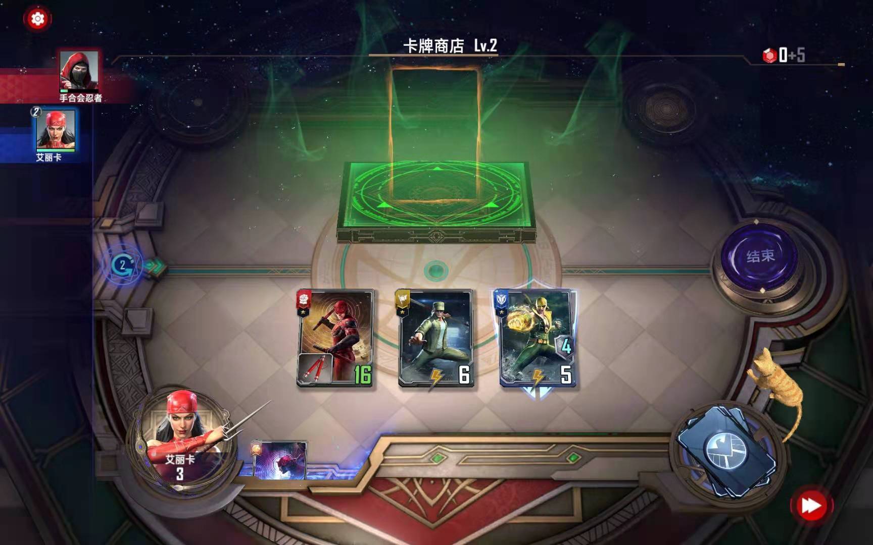 第二小节:购买手合会,然后商店送一张漫威骑士的卡,有经济的话就买下来,我的送的是凯奇,直接升级到了二星凯奇。阵容按照下图摆放: