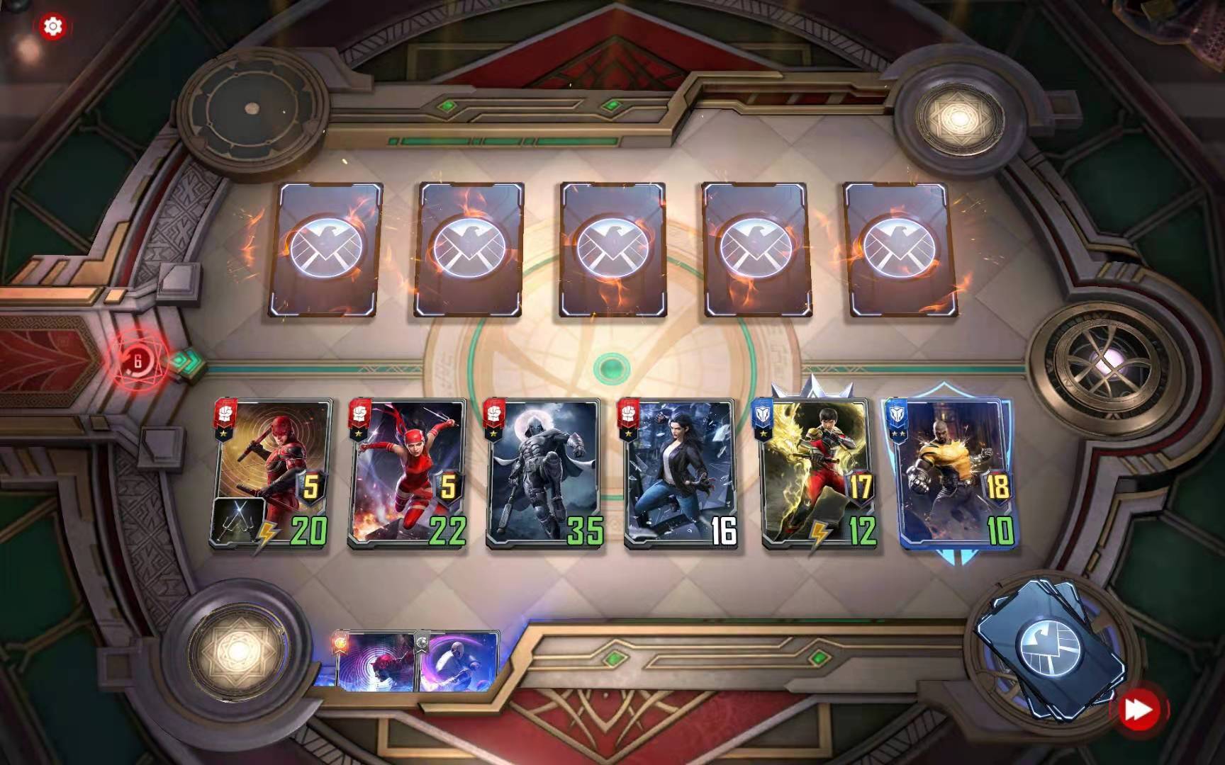第二小节:先购买凯奇、超级玛丽、并把这两个打到场上以后,然后购买吸收人完成金并任务,最后购买手合会并打出,这样完成任务可以加的buff最多,并按照下图摆放: