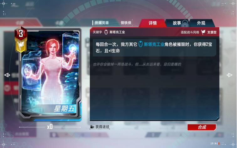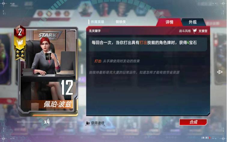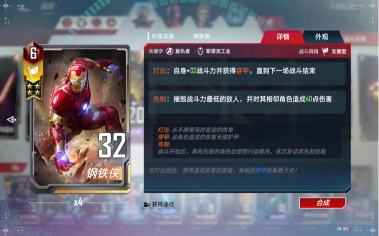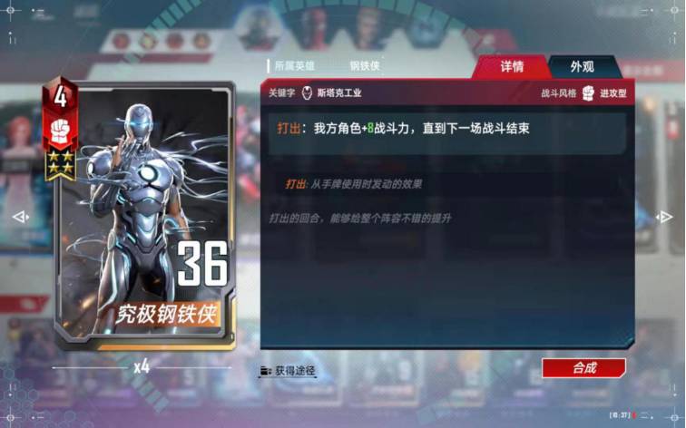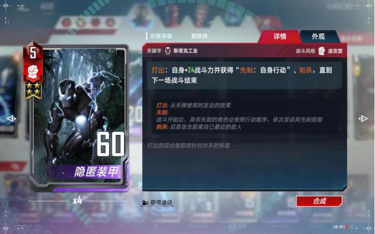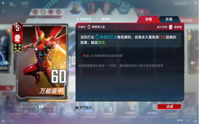 这张卡佩戴给隐匿装甲或者究极钢铁侠后非常给力,可以重复打出给万能增加伤害。