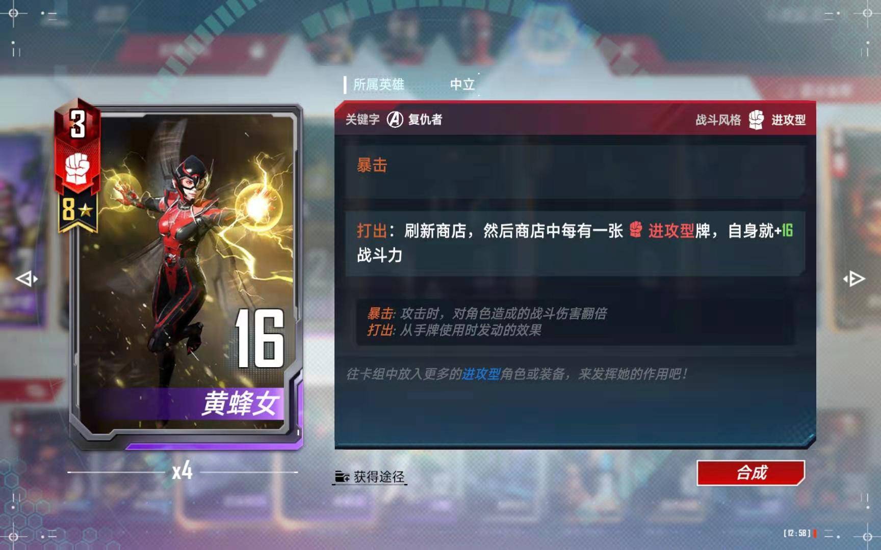 战甲升级实际上是一个经济技能,使用战甲升级以前,尽量卖完场上无关的随从,只留八星黄蜂女、四星以上的复仇者之类的卡在场上。可以稳定获得一张高质量的复仇者单卡,如果能复制一张八星索尔,实际上相当于是免费获得了40点宝石。如果能多获得一张八星黄蜂女,则有可能获得天梯中最接近“16星”的黄蜂女,黄蜂女再次打出以后,战斗力可以从150左右变成200以上,而且是两张“准16星”黄蜂女,是非常给力的。