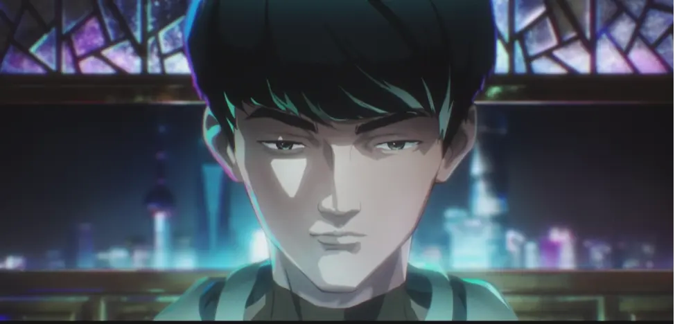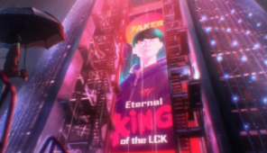 大厦中间的屏幕上,画面闪烁,Faker登场,英文为“EternalKiNGoftheLCK”,意为“LCK不朽的王者”。画面左侧是一个身穿DK队服的人打着伞,凝视着Faker的宣传画。