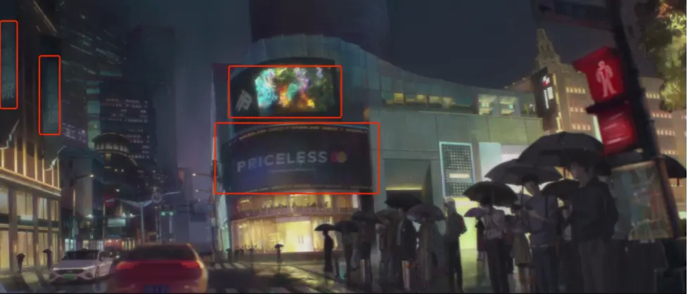 这张图右边的两张竖着的广告牌,一个是“华彩剧院”,一个是“泉水百货”。上面播放的是游戏内画面,那个斜着的标志是官方多次提到的“不破不立”英文“MAKE/BREAK”的首字母缩写MB,后续还会不断的出现。这里我一开始以为是iB,看到后面才确定应该是MB。
