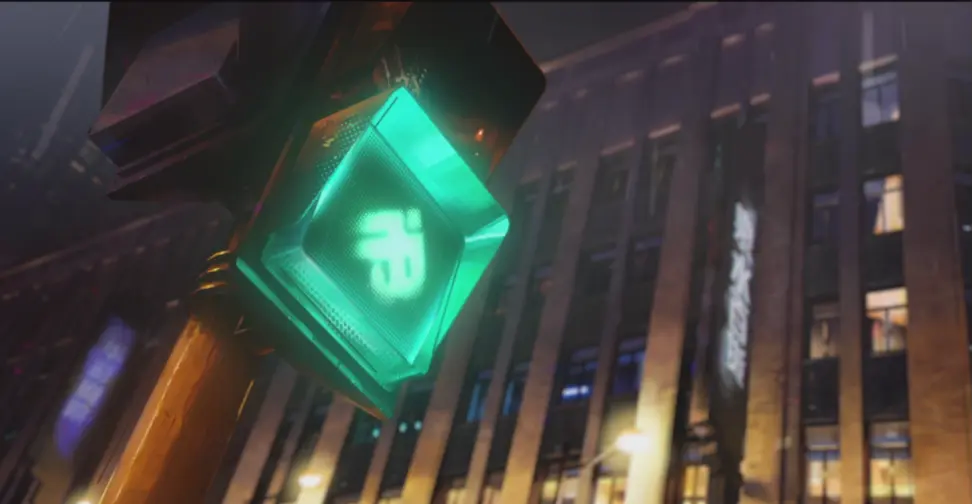 镜头回到人行横道,红灯转绿,绿灯里不是常见的人形,而是刚刚斜着的MB标志。另外,灯后面的大厦上的广告牌,还是刚刚的泉水百货和华彩剧院。