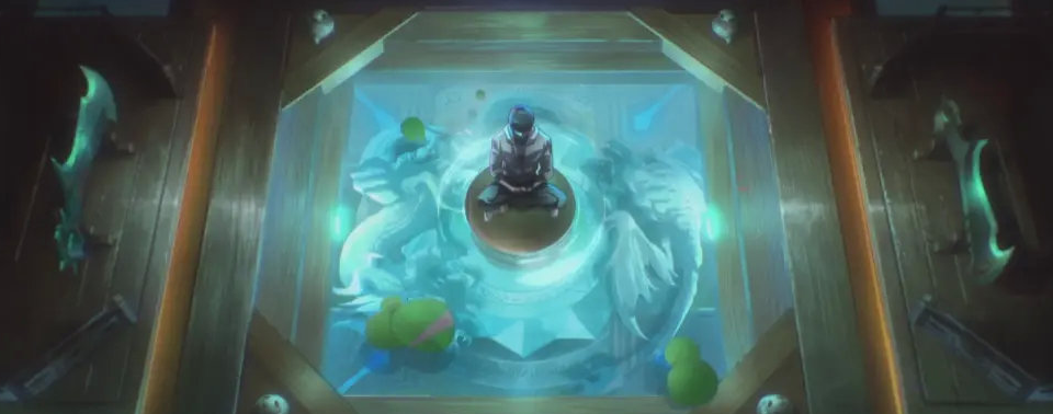 一个人在水池中间冥想,LPL基地的建筑风格,看左右的德莱文斧头,还是JackeyLove。
