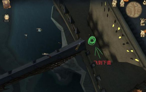 我们需要飞到这座桥和城堡的交接点,就是图片里标注的地方,然后就会发现一个光点,点击就能拿到线索了