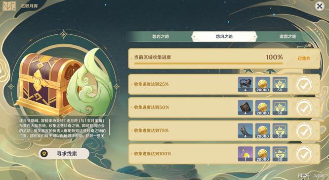 蒙德地区和璃月一样,都是在璃月港找NPC琳阳对话,会给你标记一小部分的玄月宝箱和逐月符位置,每天只是提供一部分,想要快速完成只有慢慢查找,以下是我完成100%收集的路线,提供大家参考寻找