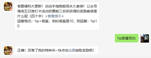公众号海岛五日游打卡活动投票前三名所获得的奖励套装是什么呢?这是2021年10月9日和平精英游戏官方为每一位喜欢玩吃鸡游戏的小伙伴们带来全新的微信每日一题!诸位亲爱的吃鸡玩家都有及时的关注吗?如果你还没有知晓正确的答案的话,就赶紧来看看小编为你准备的正确的答案吧!