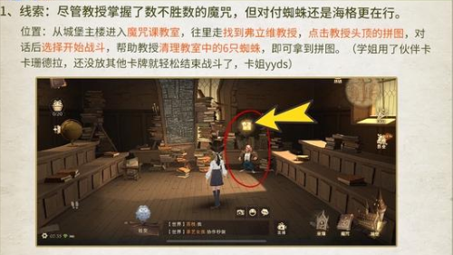 前往魔咒课教室,找到弗立维教授,对话后进入战斗(打小蜘蛛),战斗结束后获得拼图!