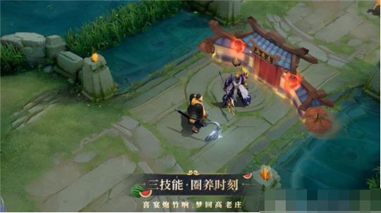 使用大招时,猪八戒直接框出了一个张灯结彩挂红灯笼的高老庄,刚好在举办喜宴,非常具有喜感!