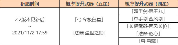 ●活动期间,限定五星武器「弓·冬极白星」「法器·尘世之锁」的祈愿获取概率将大幅提升!