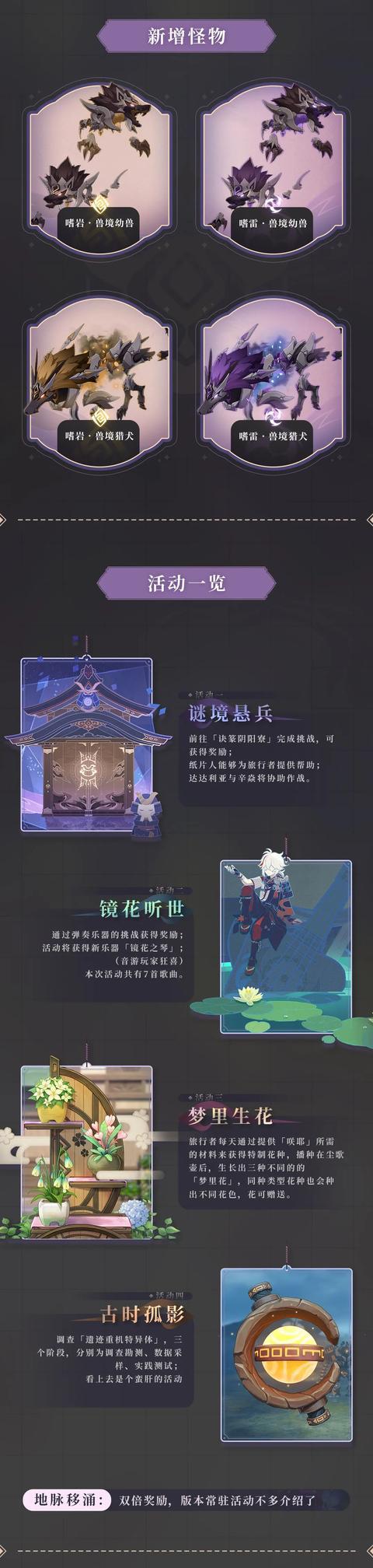活动期间,完成万叶的特殊委托后,使用他赠予的乐器与角色一同演奏曲目,达成相应积分即可获取小道具「镜花之琴」、原石等奖励。