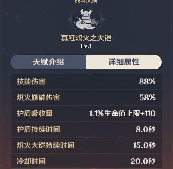 2、炽火大铠:处于炽火大铠效果下的当前场上角色进行普通攻击时,将触发炽火崩破,造成火元素范围伤害,并唤出护体的烈烧佑命护盾。炽火崩破每1秒至多触发一次。