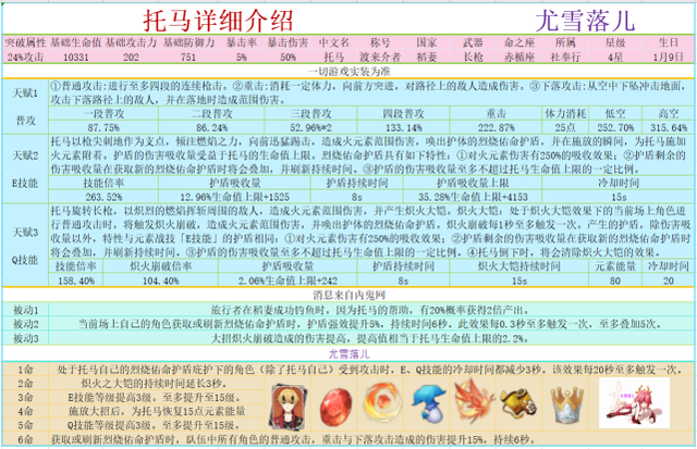 3、产生的护盾,除伤害吸收量以外,特性与元素战技「烈烧佑命之侍护」的护盾相同:对火元素伤害有250%的吸收效果;护盾剩余的伤害吸收量在获取新的烈烧佑命护盾时将会叠加,并刷新持续时间。护盾的伤害吸收量至多不超过托马生命值上限的一定比例。托马倒下时,将会清除炽火大铠的效果。
