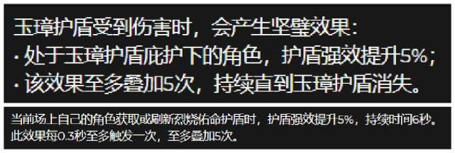 四、甲衣交叠:获取或刷新烈烧佑命护盾时,当前场上角色的护盾强效提升5%,持续时间6秒。此效果每0.3秒至多触发一次,至多叠加5次。