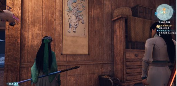 继续前进会接到支线【万物有灵·贰】,进入客栈,在门口与女人对话,接取【夺回珍宝】支线。在后文为大家说明攻略。在客栈内和小二对话,然后调查旁边的山神画像,就可以上楼休息了。