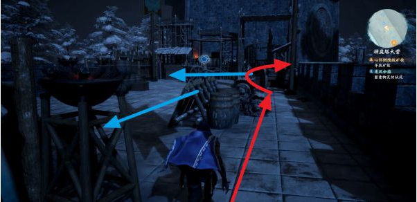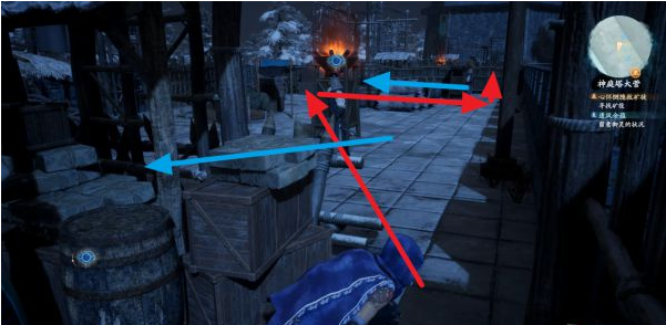 这里要躲避守卫的侦查,我为大家画出路线,红色为我们走的路线,蓝色为守卫巡逻路线。