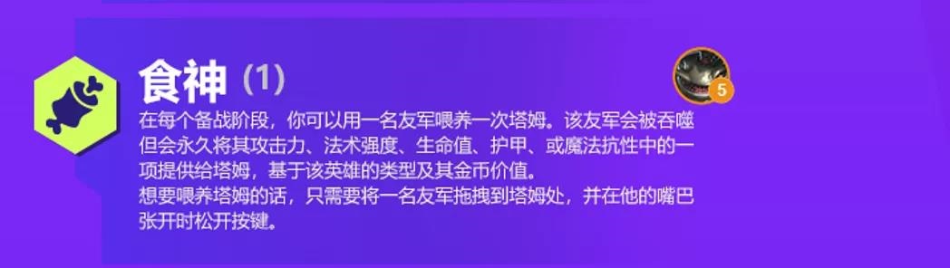 食神,塔姆独有羁绊,备战阶段直接喂食塔姆,永久增加其4维属性之一,如果塔姆能来的特别早,收益会非常可观。
