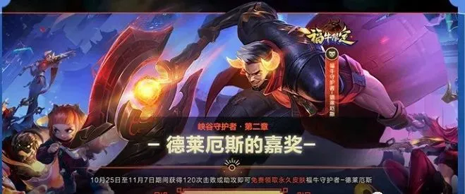 从10月25日至11月7日期间累计获得120次击杀或助攻,就能获得诺手的永久皮肤福牛守护者-德莱厄斯。