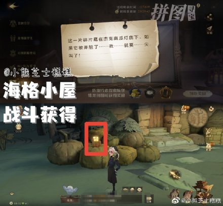 这个提示其实不太明显,因为活动南瓜灯太多了,其实这个碎片位置在海格小屋外面的南瓜灯上,直接在海格小屋外面找到这个碎片就可以了!注意这个碎片是要战斗的喔,当然很白给就是了!