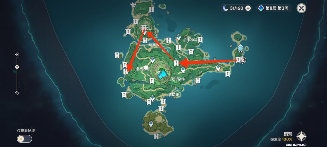 注: 图中白色六角星⭐指的是第四天完成鹤观任务,去对话鬼影子会完成一个成就,其他的影子都没用,只有鬼婆婆会给3个绯樱绣球。❗指的是海螺位置。