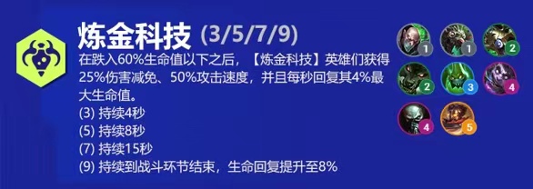 生命值跌入60以下,炼金科技的英雄获得减伤,增加攻速,每秒恢复最大生命值。