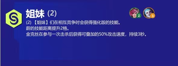姐妹组合强化技能,蔚是增加技能距离2格,金克丝击杀一次获得可叠加的50%攻速。