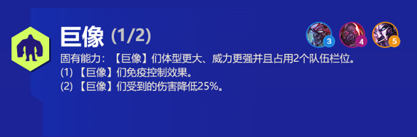 固有能力:[巨像]们体型更大、威力更强、免疫所有控制效果并且占用2个队伍栏位。